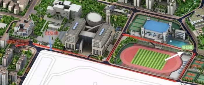 2.活动路线:从含弘广场(校前广场)向学海南路出发,经图书馆,环绕学校田径运动场外围道路一圈(不进入运动场),在体艺馆游泳池对面的平台处签到,再回到含弘广场(校前广场)止。具体路线见下图: