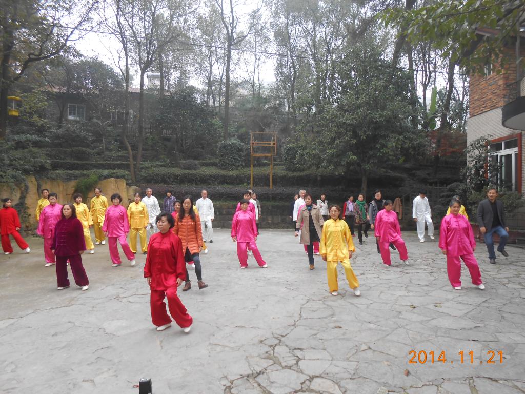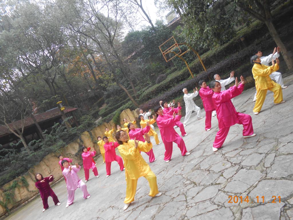 在简洁的开幕式后,老年大学的学员们身着靓丽的太极服装,表演了陈式太极拳24式、太极剑和养生操。表演者整齐的身姿和随风微动的太极服,在南山的半山腰间转身、踢腿、舒腰、舞剑,举手投足间,真可谓接天气之灵气,更让人体会到陶渊明“悠然见南山”的意境。