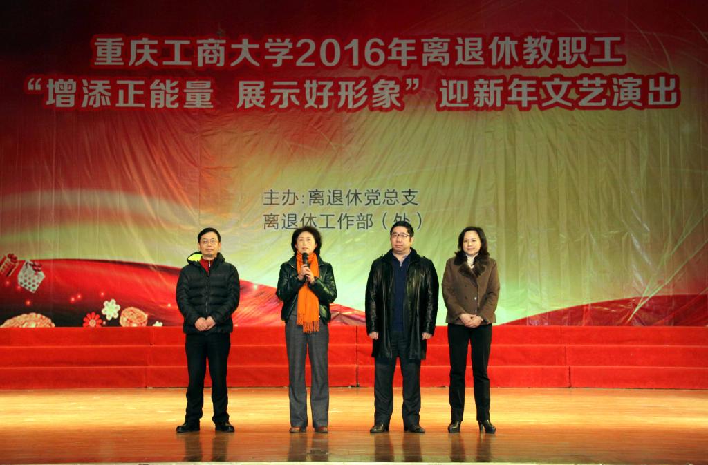 演出开始前,学校党委书记李春茹教授致辞。她说,在过去的一年里,学校在教学、科研、学科队伍建设等方面等取得的成绩与老同志们多年来打下的良好基础分不开,我代表学校党委行政对老同志致以衷心的感谢和崇高的敬意。我们要对新的一年充满期待,满怀信心,在全校师生的共同努力下,期待2016年取得更加突出的成绩,希望明天更加美好。最后,她祝各位离退休老同志新年快乐,万事如意,身体健康,阖家幸福!