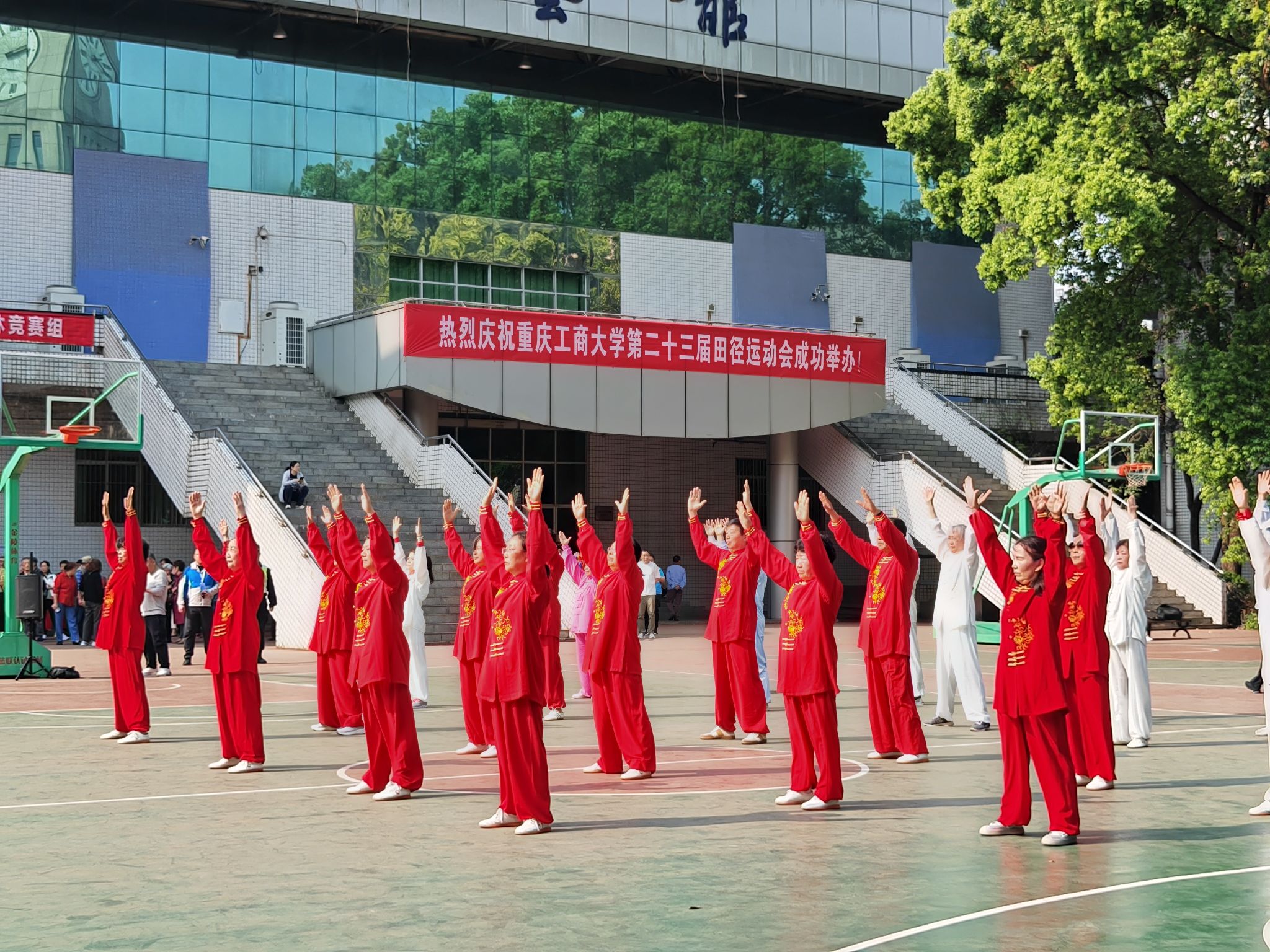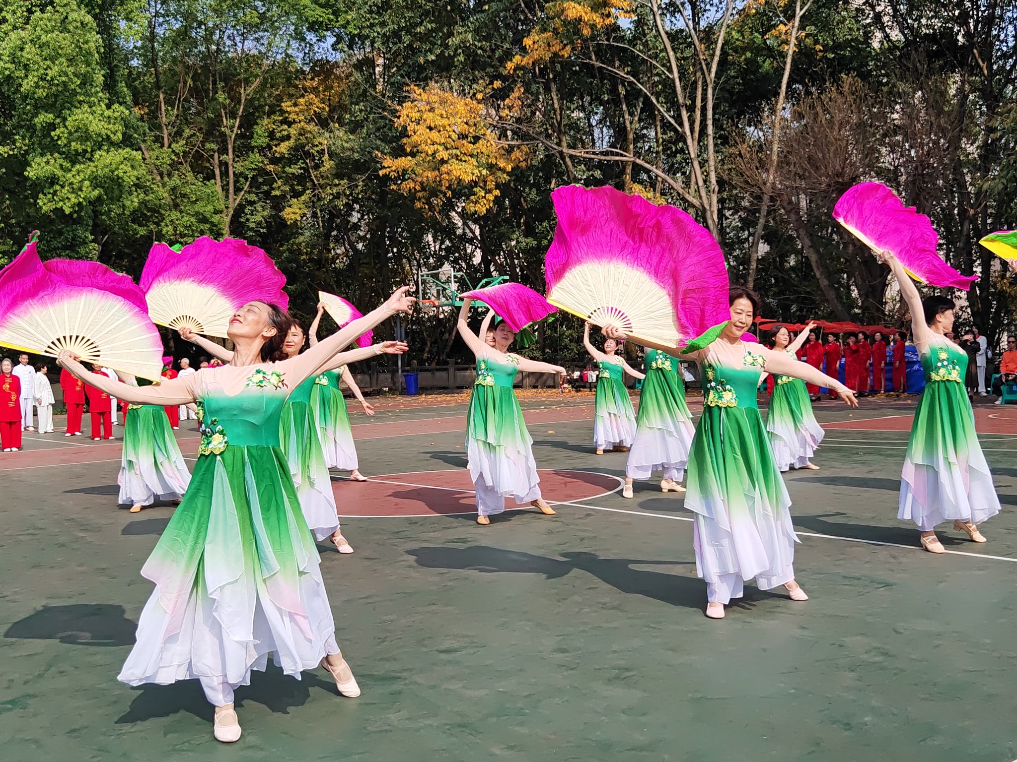 紧接着,学校领导与老同志们一起观看了开幕式节目表演。老年大学代表队带来了端庄优美的时装秀、扇子舞和一气呵成的太极八段锦表演。他们的精彩表演,赢得了在场观众的热烈掌声。